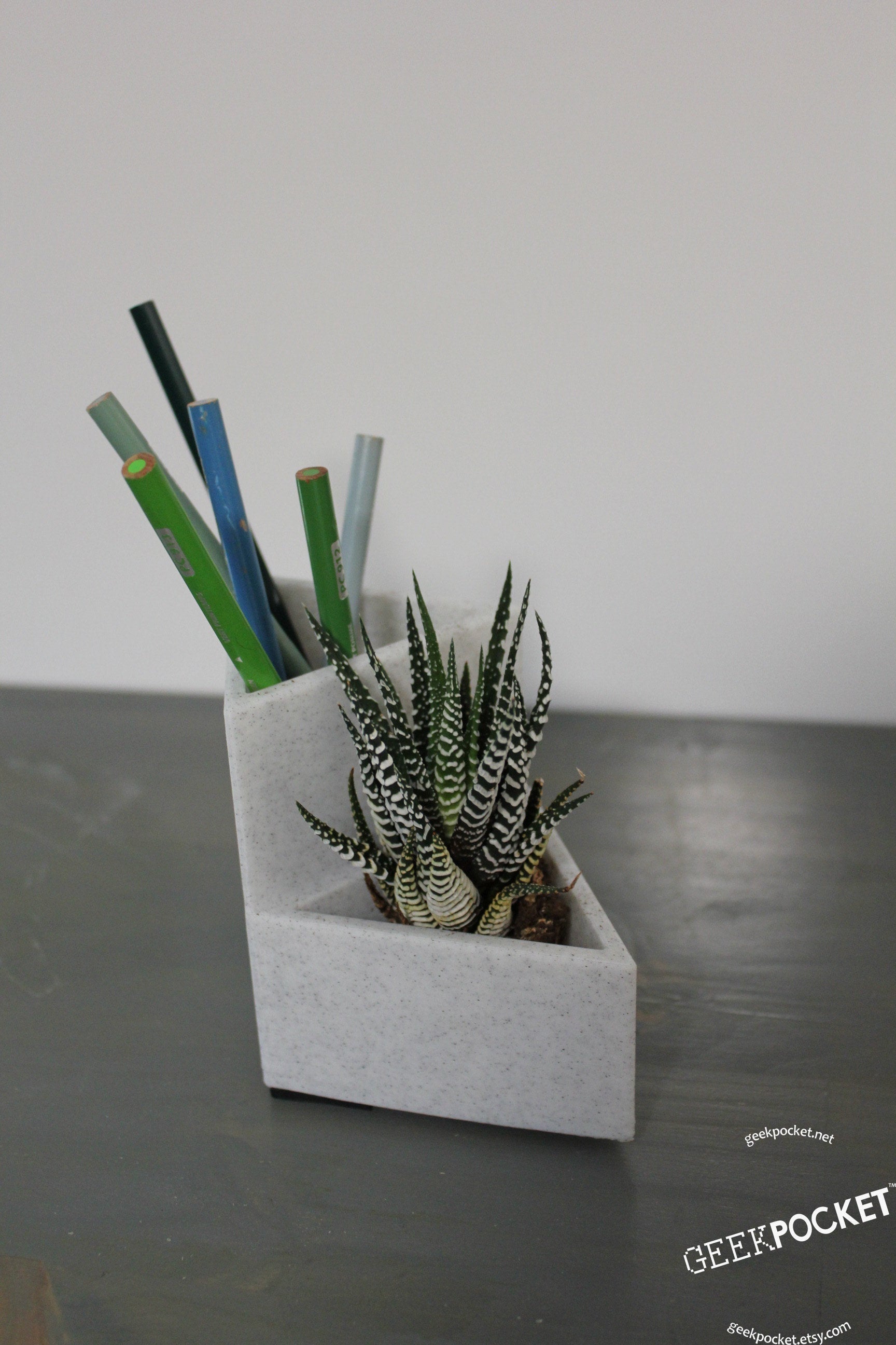This unique modern planter has space for two succulents/small plants, or can be used to organize your desk space! It makes for a perfect pencil holder.